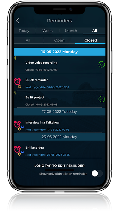 Straight after you make a record, you need to set a reminder, which is useful to not forget to use it in the future. The system is automatically organizing your recorded files in chronological order, the newest one will appear on the top of the list. The files can be sent via email if preferred.